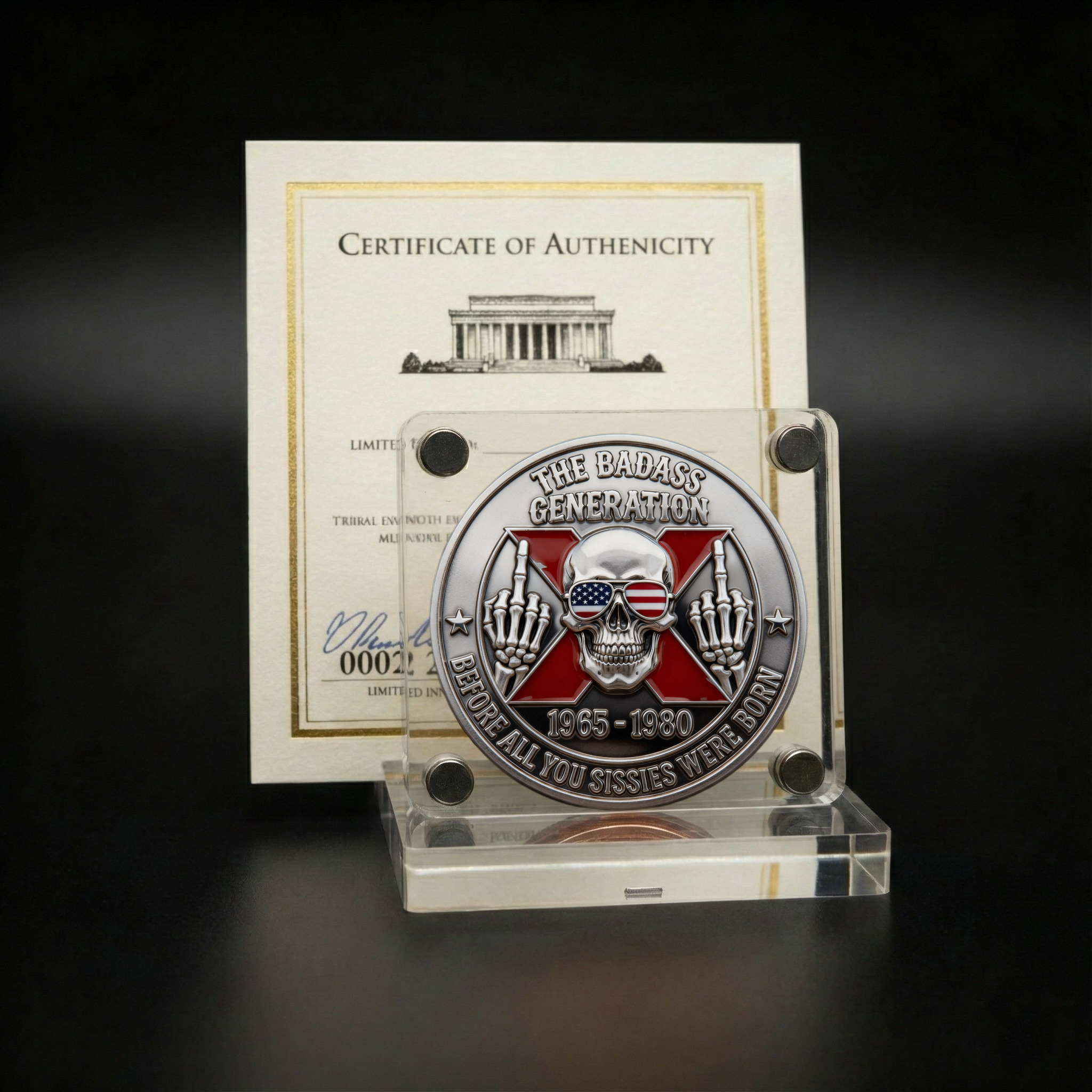 On the front of the coin, the skull—adorned with American flag sunglasses—is the ultimate symbol of defiance and attitude. The bold middle finger signifies the rebellious spirit of Generation X, rejecting the norms and embracing a life of freedom and uncompromising individuality. The red X highlights the distinctiveness of the generation, standing strong against the tides of time. 🇺🇸💀✌️